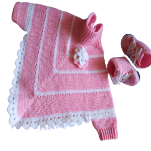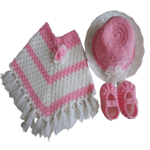 Highneck crochet baby poncho/pink_white pullneck crochet poncho with matching booties